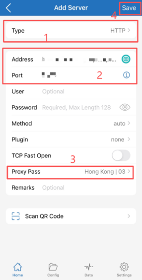 如果B2proxy中采取API提取链接,则输入从B2proxy获取的主机地址和端口,填写完成后在【Proxy Pass】中选择任意使用 Trojan 协议 的非中国大陆节点即可,最后点击【save】。